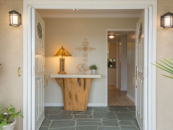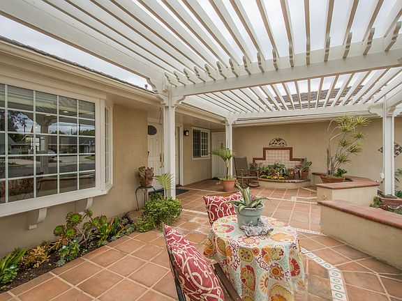 Curb appeal abounds at this charming home presenting with a spectacular Jacaranda tree, a perfectly manicured yard and inviting courtyard within the presidential tract. Double doors welcome you to an inviting entry and a freshly painted interior. Beams of sunlight fill the spacious living room through the bay window dressed with a seating bench, molding and retractable shades. This open area flows into the kitchen, dining, and the family room featuring vaulted wood ceilings with illuminating skylights, a fireplace and a sliding glass door providing access to outdoors. Partake in family meals under the covered patio while enjoying views of the lawn, blooming planters and multiple fruit trees. The upgraded kitchen boasts bright white cabinets with glass doors, ample granite tile counters and a bay window overlooking the yard. Off the kitchen is a separate sun kissed utility room with laundry and extra storage and counter space. Down the hallway is a full bath with a skylight and all four bedrooms. Once again natural light fills the home, this time in the master bedroom through sliding glass doors leading to the backyard. The expanded master bathroom holds a spectacular jetted tub for your relaxation. Beautiful and bright, this house wants to host you and your family for years to come! Welcome home.