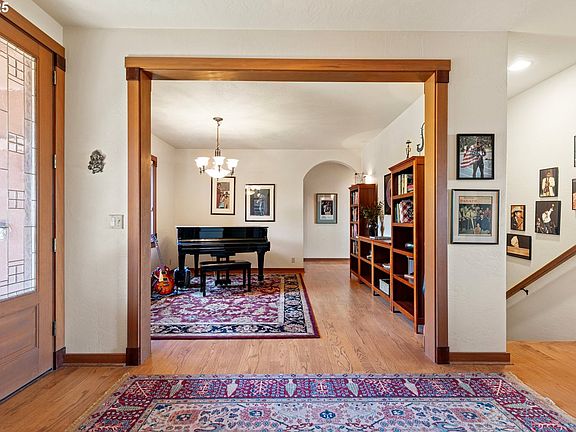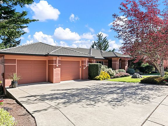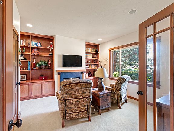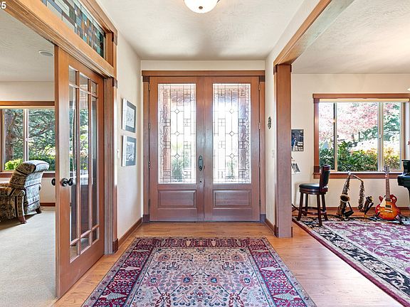 Custom South Eugene Sanctuary with Iconic Views & Luxury Finishes. Welcome to your private retreat in the heart of South Eugene- a truly special home where architectural artistry meets everyday comfort. Built in 2001 and immaculately maintained, this 3,394 sq ft residence sits on a beautifully landscaped .43-acre lot with panoramic views of the city skyline, Autzen Stadium, and the surrounding mountains. From the moment you walk in, the home impresses with hardwood floors, custom cabinetry, and an open layout designed for both entertaining and tranquility. A highlight of the home is the inclusion of three original Frank Lloyd Wright designed transom windows, casting elegant light across the den and primary suite.The primary suite is a serene haven, complete with a walk-in closet, jetted tub, and gas fireplace. In total, the home boasts three gas fireplaces, a theater room outfitted with two authentic chairs from Cowboys Stadium, three expansive decks that span the rear of the home and a gourmet kitchen with a custom Wolf stove perfect for culinary enthusiasts. Outdoors, you’ll find a rare combination of beauty and utility: a tiered garden, fruit orchard, multiple sheds, and drip irrigation system. The four-car garage is complemented by four under-house storage bays, offering space for all your gear and hobbies.This energy-efficient Super Good Cents home also features Hardiplank siding, a 50-year concrete tile roof, new HVAC, and newer exterior paint, ensuring both style and durability for years to come. Call your realtor and schedule your showing today!