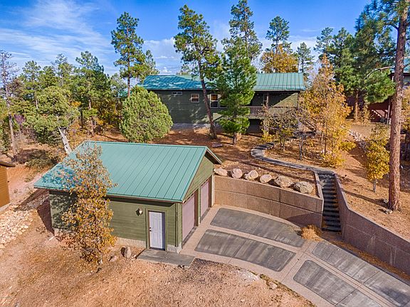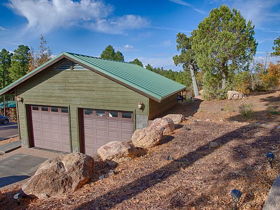 This gorgeous cedar sided cabin nestled on a hill lends to panoramic views of the pines from the front covered deck. This home has the ideal open, split bedroom floor plan that everyone is looking for. The fireplace is the crown jewel of the living room with stacked stone from the floor to the tongue and groove ceiling. The kitchen features granite counter tops, a gas stove for even cooking, and a breakfast bar, perfect for entertaining. The property is landscaped with a sprinkler system and a fenced back yard for fido. There is also plenty of room for parking with the 2 car garage and concrete driveway. Hurry, this one won't last!!!