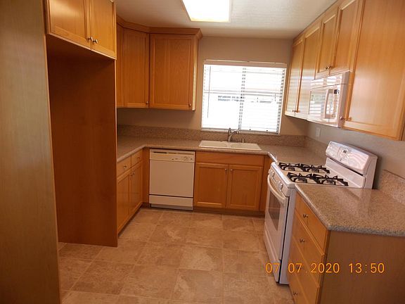 2 bedroom SENIOR home located in Sun City, a 55+ premier community of Menifee. Walk into the home and you are greeted with a large living area with a fireplace that connects to the kitchen. The kitchen is quaint with grey counter tops, upgraded appliances and cabinets for storage. Down the hall you will find the guest bathroom that includes a shower stall with a single sink vanity. The guest bedroom is fairly large with mirrored closet doors. The master bedroom is also large and a private bathroom. The master bathroom includes a large mirrored closet, his and her sinks with a shower/tub combo. Laundry is located inside the home with its own area that includes shelving and washer/drier hook ups. The back yard is fenced with a cemented and covered patio. This home is close to multiple shopping centers and the 215 free way.