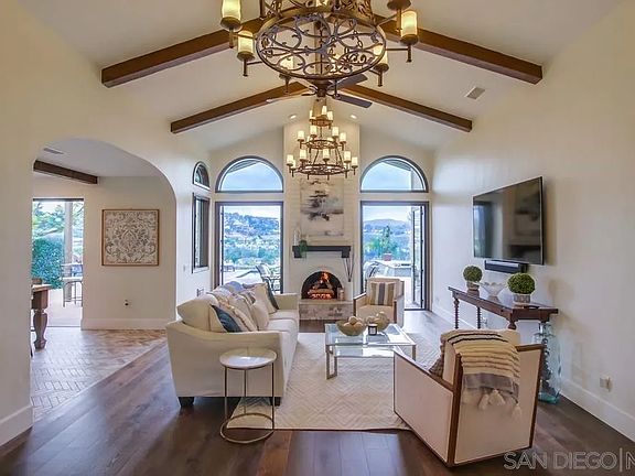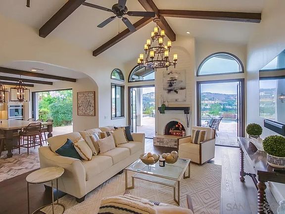 GOURMET KITCHEN -10 ft Island with custom Taj Mahal quartzite counter top with sink looking to view. 48 inch gas range top with 6 burner and indoor grill with Custom Range hood with hand painted stone tile, Miele dishwasher, Thermador built in refrigerator, Double electric ovens, microwave drawer. 12 foot La Cantina Pocket door open to outdoor kitchen and pool for indoor/outdoor living. Custom cabinetry w/ pull out double trash, lazy Susans in corner, large drawers for convenience, large pantry with pull out shelves. Beautiful chandeliers, upper and lower cabinet lighting and can lights. Kohler sink system w/ cutting board, strainer and drain racks MASTER SUITE - Large room with View to pool and city lights. 19 linear feet of closet custom organizers. Top mount custom concrete sinks, quartz countertops, damless walk-in shower w/custom glass. Decorative framed mirrors, Drawers in custom vanity w/ make up area w/ pull out hair dryer and product areas. OUTDOOR LIVING - Glass back wall for Stunning view of city lights & canyon homes. Pavers patios by Pool and raised spa, salt water system and wifi start and lights. Covered patio with wood burning fireplace and gas firepit! outdoor kitchen w/ ice maker, double keg ENTERTAINERS PARADISE- Dramatic 14 foot ceiling in great room & dining area with wood beams, two La Cantina 8 foot French doors lead to outdoor living. 9 foot ceilings in other spaces. French Oak wood floors thru out with designer tile in baths, kitchen and laundry. (no carpet) Double pane low e windows thru out. Designer paint colors with 5 inch and 7 inch baseboards