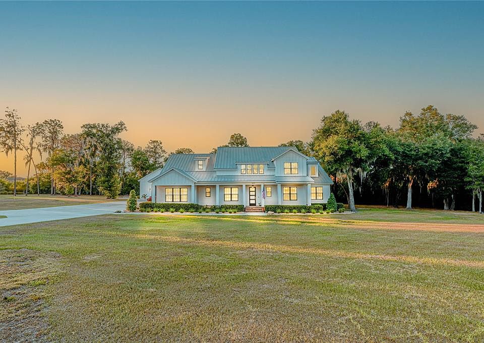 South Lakeland 2.55 Acre Estate. Welcome to your 5 bedroom, 4 full bath, 2 half bath, 3 car garage PLUS a 1500 square foot flex outbuilding private estate nestled on over 2 and a half acres. A rarity being located this close to downtown Lakeland with a beautifully wooded setting. Entering your estate through a private gated entrance, you will be assured that the fully fenced acreage will be a perfect place for the family and pets to have plenty of room for every activity. The front porch, accented with permanent LED color wheel lighting and tongue and groove stained ceilings, welcomes you to this contemporary farmhouse. Immediately feel at home upon entering and enjoy the custom features at every turn. The chef’s kitchen is a cooks playground appointed with stainless cooking equipment, microwave drawer and oversized refrigerator and freezer. The quartz appointed island is the center of the home and opens to the great room featuring a linear fireplace and stained wood beam. On the main floor is a spacious primary suite featuring a spa experience bath large master closet with washer and dryer. Shiplap walls lead you upstairs to the additional 4 bedrooms and 3 baths all appointed with every detail to make family and guests feel at home. The spacious lanai spans the full length of the home ending with a functional outdoor kitchen perfect for entertaining. Relaxing lounge chairs rest in the oversized pool’s beach area which overlooks the firepit and back yard. An oversized 3 car garage and oversized driveway has plenty of space for your family’s vehicles and toys. Wow, over 1500 square of air conditioned detached out building finished as a gym with padded floor is located conveniently at the end of the long driveway. This flexible space has an extra wide 16-foot-tall glass panel overhead door perfect for opening the space or parking your tall boat or RV and half bath and an industrial big ass fan. This building is finished with an additional large lanai with automatic shades hot tub. All this secured by a stand and seam metal roof and Hardi plank siding. Two separate lots are included for future family homes, extra space or investment. Schedule your tour today and don’t miss this opportunity.