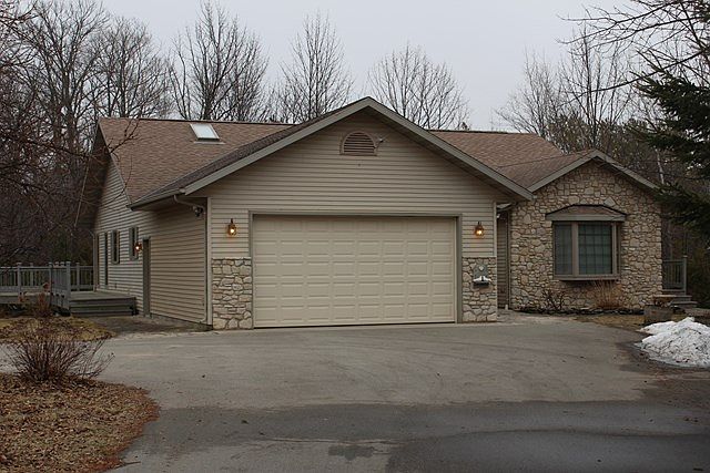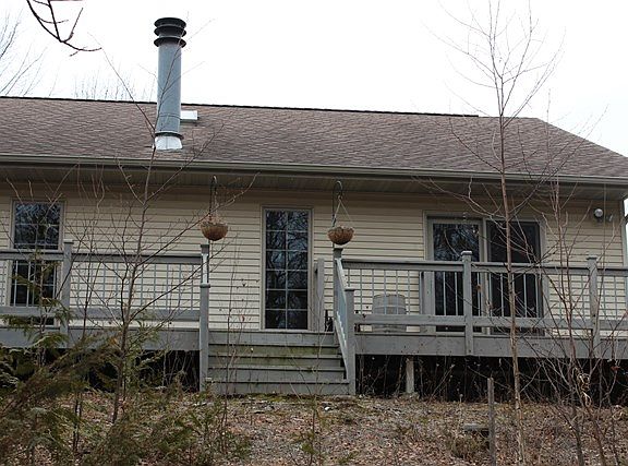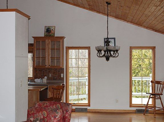 This one bedroom, one bath home has beautiful wood floors, wood ceilings, sky lights, a field stone wood burning fireplace, cathedral ceilings and a wrap around deck to enjoy the wildlife all around you. The natural light adorns every room on the first floor of this home. There is an attached 2 car garage and it also has an unattached 2 car garage with tons of storage. The basement of this home is partially finished with a carpeted large living room area. The kitchen has beautiful stainless steel appliances with a large butcher block island. The dining room, sun room and bedroom all have a patio door that walks you out to the wrap around deck. This natural setting is a beautiful mix of trees and it also has a pond to enjoy!