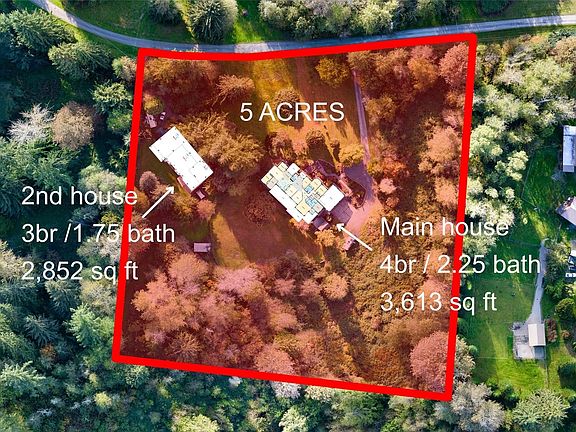 Motivated Seller!Improved Price! Two homes on 5 acres!Main home is a 3613sqft rambler built in 1992(handicap accessible) w/875sqft attached 3-car garage.2nd home is a 2852sqft tri level built in 1975 w/495sft attached garage.Many possibilities for this layout,w/7 potential bdrm options,2 living rooms & 3 deck areas.Updated kitchen w/a ton of storage.Primary bdrm w/it's own kitchenette & bdrm size closet.Fully fenced back yard & a huge pasture area ready to be cleared.Second home has its own driveway,yard & privacy!Ready for a little TLC, the main floor(1124sqft)& upper floor(864sqft)have been used as a rental,lower floor(864sqft)is unfinished.Each home has it's own 4bdrm septic & electricity;& share a Well. 3-min drive to I-5!