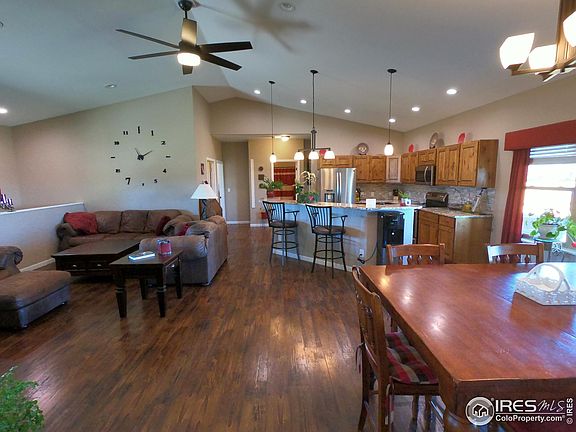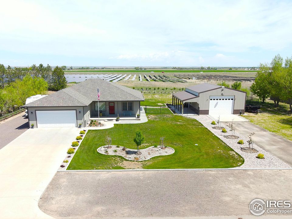 Looking for a Beautiful Ranch Style Home on 1 Acre Right Out Side of Town? Here it is! The 1200 SF shop is insulated with propane (100# propane tank included) and electric heat with a 12' door and opener. 10' Lean-to with concert porch attached to the shop. Fully fenced back yard with black vinyl coated fencing. Double gate for back yard access. Full irrigation system with Wi-Fi control system. New in 2023 Class 4 impact resistant roofing with transferable warranty. Fresh exterior paint in fall 2023. The great open floor plan of this home includes a beautiful kitchen with a large breakfast bar, granite countertops, stainless steel appliances. There is a separate dining room too. The master suite is complete with a walk-in shower and a large walk-in closet. Main floor also has 2 bdrms, a full bath, laundry room with cabinets and slide out pantry. The finished basement has an amazing entertainment area, a large family room, a bonus room, 4th bdrm and a full bath. The finished, insulated and heated attached garage has built-in cabinets, a sink and a water spick-et so you can wash your car/truck. On-demand Tank-less water heater and a High Efficiency Furnace/Air Conditioner. New in 2023 Wi-Fi monitored Water Softener and whole house water filter. Ring Door bell and outdoor security cameras are included. RV parking with 50Amp electrical hookup and dump station. Lawns planted with Emerald III tall fescue blends. All shrubs and trees have a drip systems. Property is planted with drought resistant native Buffalo Grass. Irrigation lines installed below frost zone, easy air blow-out and heated back-flow prevention. Three frost proof water hydrants. Overhead steel shelving in garage and built-in cabinets remain. Enjoy your new Home!