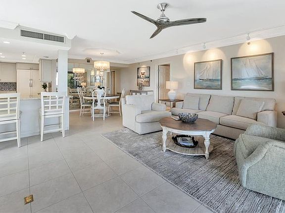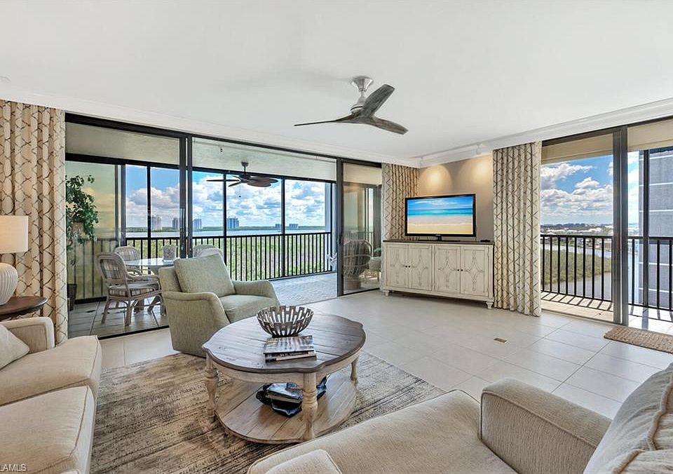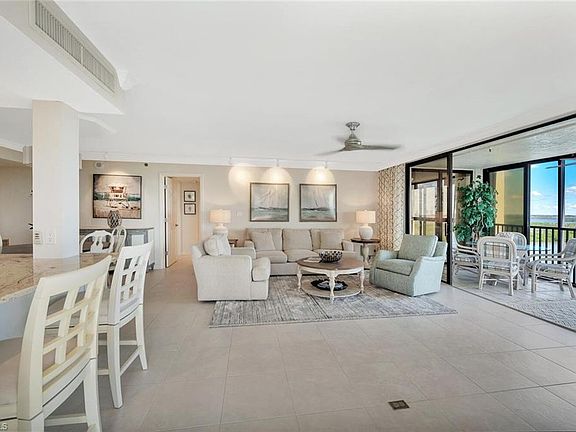 This rare 10th-floor residence is truly a "10." Showcasing panoramic views of Estero Bay, the Gulf, and the lush mangrove estuaries beyond. Begin your day with breathtaking sunrises over the bay and end it with spectacular Gulf sunsets from your wrap around lanai, complete with custom roll-down shades for comfort and privacy. Beautifully remodeled, the. condominium boasts porcelain tile flooring, granite countertops, a reverse osmosis. water system, slow-close cabinetry, and custom-paneled Kitchen Aide appliances. Crown moulding and neutral tones enhance the light, airy feel, while floor-to-ceiling windows frame the captivating views. Thoughtfully maintained with a new water heater (2025), washer/dryer (2022), air conditioner (2020) and power hurricane shutters, this home also features a deeded undercover parking space. Residents of Bay Harbor Club enjoy resort -style amenities including pool, spa, tennis, pickleball, clubhouse & private beach access with boat docks available for lease. Whether as a year-round residence or seasonal retreat, this exquisite property offers the very best of Florida's coastal lifestyle: luxury, and timeless waterfront beauty.