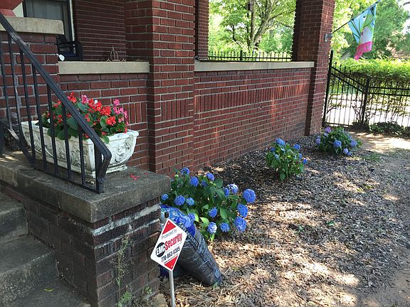 Wrought-iron fencing surrounds this charming all-brick 1920 Craftsman home. Large Southern front porch runs the length of house with tile floor and brick columns and beautiful bead board ceiling. Fenced backyard is an oasis featuring a brick patio, Koi pond, lush vegetation, an electric gate, and an out building. Foyer introduces a staircase that leads to a huge finished bedroom or bonus room with two skylights and lots of nooks with little windows perfect for imaginative children to play, or just more than ample storage. Family room features hardwood flooring, lots of windows, high ceilings, and a massive brick fireplace with original iron stove to keep you cozy. Family room flows seamlessly to very large formal dining room through original French doors. Kitchen features a large built-in china cabinet in the charming butler's pantry, original linoleum flooring, drop-down butcher block table, tin backsplash, lots of cabinets, double porcelain sink, and pantry. Spacious laundry room off the kitchen includes a utility sink and shelving. New AC and furnace. Completely rewired. Interior features include 6- to 8-inch baseboards, beautiful trim, and glass door knobs. Gorgeous master bedroom offers hardwood flooring and is surrounded by windows overlooking the park-like back yard. Master bath showcases custom slate, wainscoting, farm sink, and extra-long tub. Secondary bedrooms offer more rich trim, fireplaces with lovely mantles, and hardwood floors.