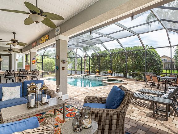 This is what Florida living is all about! From front door to pool in minutes; imagine hours of endless relaxation around the sparkling pool. Remodeled and situated on almost 1/2 acre with a 3 car garage. Great floor plan with gourmet kitchen and owner's suite on the first floor, and remaining bedrooms plus additional flex space upstairs. No doubt the favorite space will be the large screened area with expanded pool and many conversation areas and seating spaces including a bar and outdoor kitchen area. The back yard has mature landscaping and a water view providing a peaceful setting. All this in Eagle Harbor with resort style amenities close to great schools, shops and restaurants. See list of updates under the documents tab.