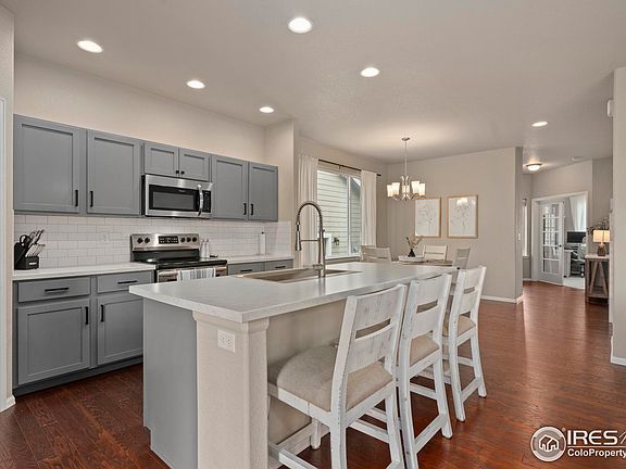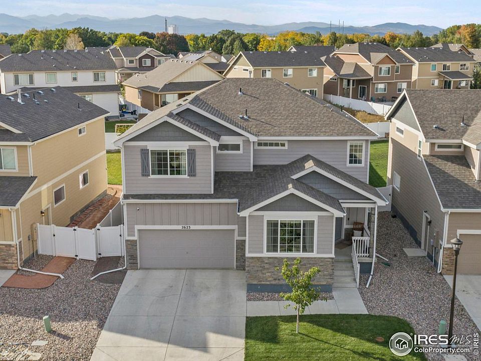 This stylish and spacious two-story home built in 2021 is lightly lived in and shows like new. Hard to find are the 4 bedrooms on the upper level plus a main floor office with French doors. This exceptional value offers a bright, open floor plan with hard wood floors, an open concept kitchen with trendy touches and a large island to gather around. Relax in the cozy family room or head outside to the covered patio overlooking the large, fully fenced and irrigated yard. Up the stairs is an unexpected loft space to be used as a second family room and the convenient, large upper laundry room. Down the hall is a private primary suite with a large 5-piece ensuite bathroom and walk-in closet. Opposite the bonus loft space are the three additional bedrooms and the full bathroom with dual vanities and contemporary finishes. The basement is over 1,000/SF of unfinished potential. If a 3-car garage is a must have, this home has it all! The new owners will appreciate the central location close to retail, dining, schools, and Downtown Loveland. Be sure to check out the beautiful neighborhood park and walking trails, all for a low $400/Year HOA.
