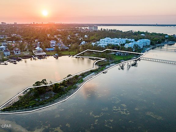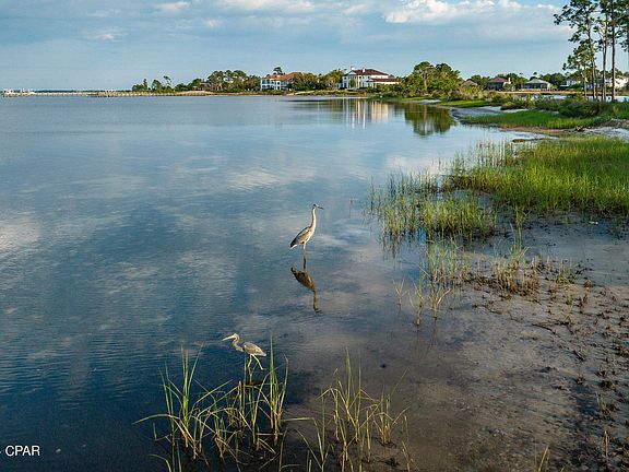 ------------ Nestled amid lush pines, oaks and magnolias, ''Fiddler's Green'' is a serene haven set on 2.98+ acres of coastal paradise. With an incredible 800 feet of water frontage, this idyllic retreat offers unparalleled views and direct access to enjoying fishing and boating in St. Andrews Bay, the Gulf beyond, or in the bayou out back. In 2005, the home was remodeled to enhance and modernize it for gracious living and easy entertaining, and now features a two-level, fan-shaped living room that elegantly divides the house into two distinct wings. Each of the three bedrooms, with private bath, is tucked within its respective wing to provide personal sanctuaries. The heart of the home lies within the spacious great room, seamlessly blending living, dining, and kitchen areas, anchored by the huge fireplace on one side and the copper-topped bar on the other. The standout feature is the expansive window wall, offering 180-degree panoramic views of the ever-changing sky, water, and shores from the comfort of home. Parades of fascinating watercraft enliven the water scene, while birds, deer and dolphins make regular appearances. With no HOA to restrict your lifestyle, a separate guest house, and a truly unique parcel of land, this extraordinary property stands as a rare find in the market. Aptly named for the perpetual joy it evokes, Fiddler's Green offers both seclusion and convenience. While providing privacy and peace, it is also just minutes away from St Andrews State Park, Bay Point amenities, and a plethora of the area's best restaurants. Schedule a viewing today to experience the romance and the magic of ''Fiddler's Green'' firsthand.