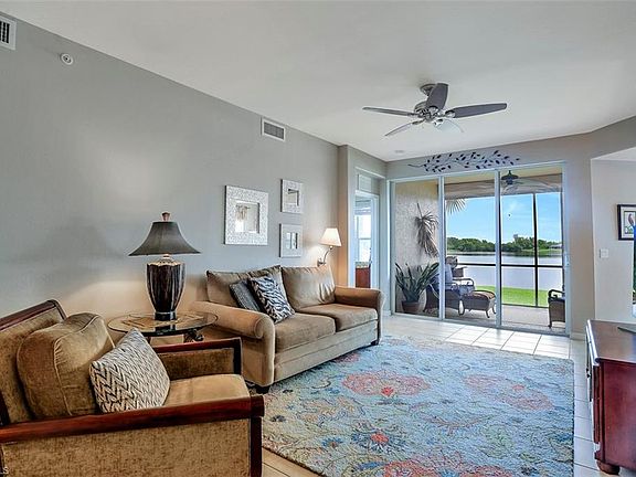 First floor condo with an amazing expansive lake view located in Sandoval, a gated community. Live the Florida maintenance free lifestyle in this well maintained condo with two generous sized bedrooms and a bonus den/home office. The kitchen offers ample counter space for food prep and entertaining with corian counter tops and wood cabinetry and is within steps of your formal dining area for those family gatherings or special occasions. The master bedroom offers more spectacular views of the lake and is a dream to wake up to in the mornings! The updated ensuite contains dual vanities with large walk-in shower with a river rock inlay and matching river rock shower floor, a rain shower and two additional shower heads, it's your personal spa-like oasis. The sellers have also installed a $4,000+ remote controlled drop-down hurricane shutter on back lanai for extra storm protection. Enjoy all that this home has to offer along with all the community amenities. Sandoval is centrally located right off Veteran's Pkwy just past Surfside with nearby shopping & restaurants. Call to schedule your private showing today!