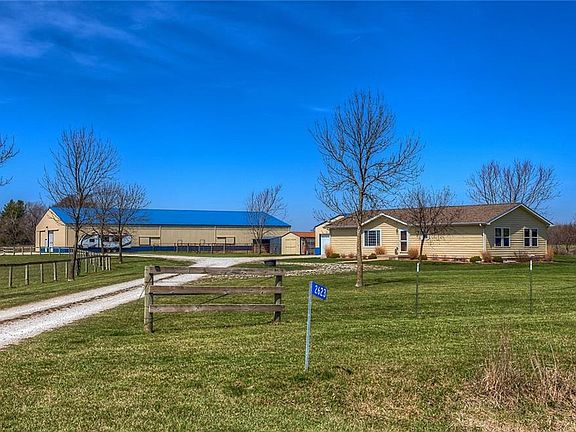Hold your horses! This is the horse acreage/hobby farm of your dreams! This ranch home sits on 19 acres with multiple fenced pastures, 7-acre hay field, automatic waterers, indoor arena, and much more! Property includes a 69x140 steel barn with roping arena, stall, tack room, water and electric; 2 lean-tos (12x18 and 10x10); a 12x16 storage shed; and a huge 4+ car detached garage. The entire property is neat as a pin and well-cared for. The 3 -bedroom, 3-bath ranch home has an eat-in kitchen (all appliances stay); main floor laundry/mudroom, 4-season room, master with walk-in closet and attached full bath; and a recently finished basement with half bath, included sauna, and egress window if 4th bedroom needed. Peaceful country views and great outdoor patio area. High-speed internet and just 20 minutes to West Des Moines.