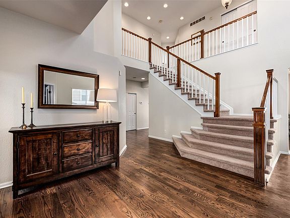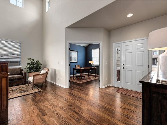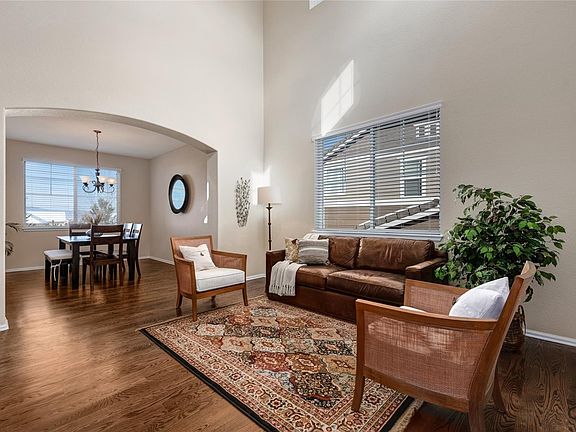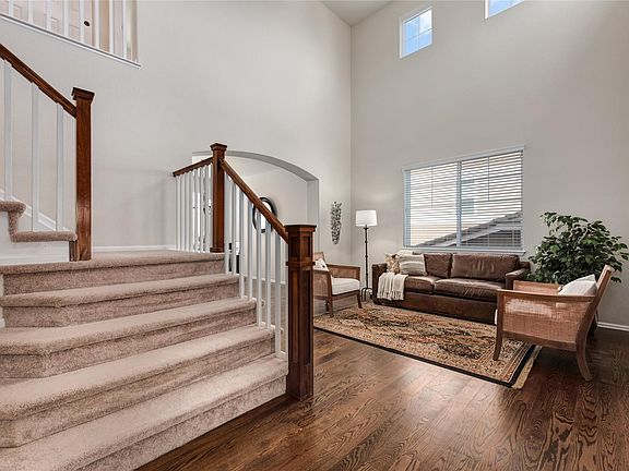 This stunning home is situated on a large flat lot with a beautiful backyard and spectacular views! This home features almost 4400 sq ft with a large unfinished basement! Light and bright, this home showcases an open concept with a main floor study, large great room, beautiful dining room, a great room and main floor powder bath. The gourmet kitchen showcases slab granite, stainless-steel appliances, double ovens, island, custom white cabinetry, wine rack and plenty of cabinet space! There is a lavish master retreat, elegant five-piece bath, "his & her" vanities and a large closet. The seller spared no expense with the stunning new hardwood floors! The beautiful backyard features mountain views and a large patio w/ fire pit. There are 4 bedrooms including the master retreat, guest retreat w/ ensuite bath and 2 additional bedrooms w/ a Jack & Jill bath. Walking distance to Clear Sky Elementary, The Grange, open space & trails. Seller has added $30K in upgrades and new hardwood floors!