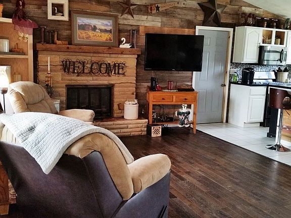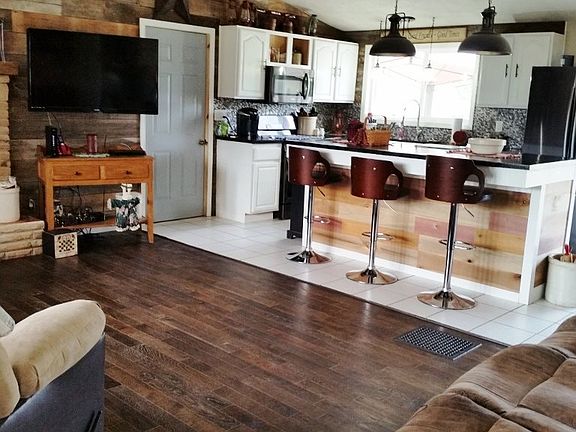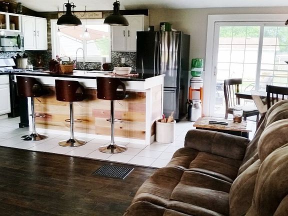 Edge of town living in this remodeled 3 bedroom ranch with many unique touches. Open living room and kitchen with informal dining. Concrete countertops and breakfast bar. Sliding barn door leading to the finished basement with family room and rec room waiting for you to enjoy with new furnace. Two tier deck off dining room with new canopy (off for winter) plus a separate deck off the master bedroom that overlooks the large corner lot. Two car attached garage and shed.