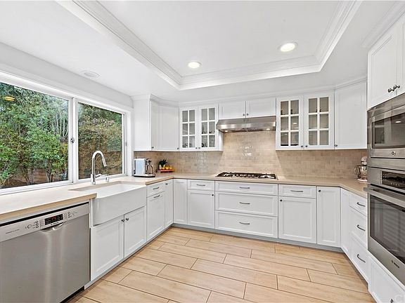 Located near both Lake Mission Viejo and Mission Viejo Country Club, this beautiful four bedroom, 2.5 bath home has been upgraded throughout and is move-in ready. A charming Dutch door greets your guests, with a spacious living room that is perfect for entertaining! Newer wood and tile floors, plantation shutters and newer vinyl windows throughout add great farmhouse style. Cooking is never a chore with quartzite countertops, subway tile backsplash, farmhouse sink, and stainless steel Bosch and GE appliances in the kitchen. All bathrooms were recently updated to add to this home's stylish appeal. Epoxy coating was completed for plumbing for added peace of mind. Excellent location with no homes behind it for extra privacy. Come home to Mission Viejo!