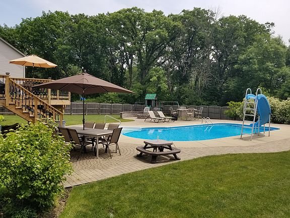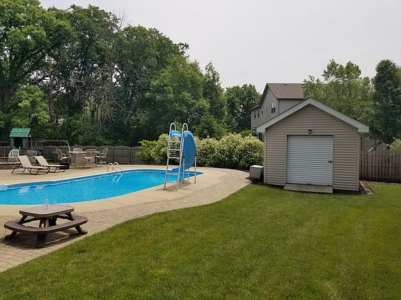 Enjoy living like you are on vacation in your own home. Huge Semi Custom family home on large, private, cul de sac in Ravine Woods with views of the woods. You will love the open floor plan with 9ft ceilings, wide staircase, formal living and dining rooms. The kitchen is the heart of this home showcasing hard wood floors, tall maple cabinets, stainless steel appliances, island/breakfast bar, and table space all overlooking family room with gas start wood burning fireplace. Kitchen also opens to large deck leading to the amazing backyard that is perfect for entertaining everyone from toddlers to adults. Large fenced yard with 36' x 18' heated in-ground pool, paver patio, fire pit, new deck (2018) with lights, sprinkler system, wooden play set and shed for all your toys it's like being on vacation in your own yard. 5 substantial sized bedrooms upstairs 4 w/walk in closets. 5th bedroom being used as office. Master suite is enormous with vaulted ceilings and space for a sitting area. Master bath boasts dual sinks, soaking tub, separate shower and super 10' x 9' walk in closet. The 2nd floor hall bath has dual sinks, private toilet room as well as its own linen closet. The English basement is partially finished with a 6th bedroom. The extra deep (9ft) basement houses a wash basin, whole house water filtration system, water softener, 75-gallon hot water heater, dual furnaces for more efficient heating and plenty of network connections for internet and cable. There are also 2 NEST thermostats. 3 car garage has 8-foot-high garage door on the 2-car side. All carpet is brand new as of 6/19/19. Pool filter, variable speed pump with built in timer and chlorinator replaced in 2017. Roof 2015. This home is in Channahon elementary school district and Minooka High School district. NO HOA!! Home has been lovingly cared for by the original owners. The location is convenient for easy access to I-55 or I-80. Located in the award-winning Channahon Park district, just minutes from Central Park, Heritage Bluffs golf course and the New Arroyo Trails nature area is in Ravine Woods, just north of the property. This home has so much to offer, if you need space, a private retreat and entertainment area, make this your new home!