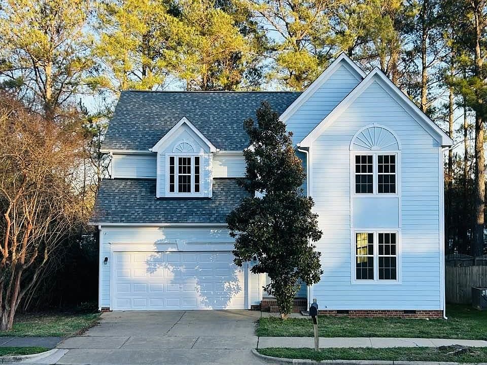 Cheerful, welcoming home with open plan, 2-story foyer, fresh paint inside & out, new flooring, new windows, 2022 roof, 2021 water heater, new lighting & brand new stainless appliances! Sunny kitchen w/island, large pantry, open to breakfast area & family room. Spacious owners suite w/vaulted ceilings, double doors, walk-in closet - plenty of room for a king-sized bed! 4th bedroom could be used as an office. Abundant storage! Clean two-car garage. Great location next door to community park, near schools, shopping, restaurants, 540, parks, hospital, Falls Lake & more!