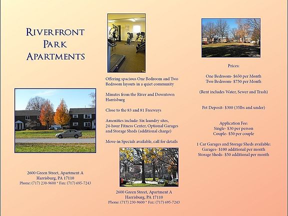 Welcome to Riverfront Park Apartments, located at 2600 Green Street in the Harrisburg section of Pennsylvania. Situated just minutes from downtown Harrisburg, fine dining, shopping, and education centers, Riverfront Park provides comfortable living at an affordable price. The community features a fully equipped fitness center, updated laundry facilities, and an onsite rental office. The apartments are simply magnificent; furnished with hard wood floors, brand new appliances, elegant bathroom designs, brand new cherry wood kitchens and over-sized windows allowing for maximum sunlight. We also have central air and heat for each unit. Want more information about quality living at Riverfront Park? Give us a call today! CENTRAL AC IN EVER UNIT WITH DIGITAL THERMOSTAT THAT YOU CONTROL 1 YEAR. FORCED HOT HEAR AND AC WITH INDIVIDUAL THERMOSTATS ALL BRAND NEW RENOVATED CERAMIC TILED BATHROOMS WITH CHERRY WOOD KITCHEN CABINETS