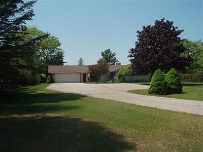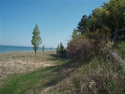 Uniquely configured low bluff frontage on Lake Michigan. Located along protected shoreline just south of Manistee Harbor, this 1.1 acre parcel with 100' Lake Michigan beach frontage features a wide mid-bluff grass terrace that presents many options for decking, gardening or perhaps croquet by the lake. The solidly constructed white brick & cedar siding home enjoys grandfathered setback that ensures outstanding lake views as well as offering the possibility of adding a second story. Walkout lo wer level leads to expansive private inner courtyard with intriguing landscaping & outdoor entertaining possibilities. There is 920 square feet of finished space on this level, encompassing lakeside bedroom; full bath; laundry & 44x20 open entertainment space with wood burning white brick fireplac e & complete wet bar. A curving drive bounded by generous lawn expanses & towering Spruce trees creates secluded entry to the property. This home should intrigue the creative thinker.