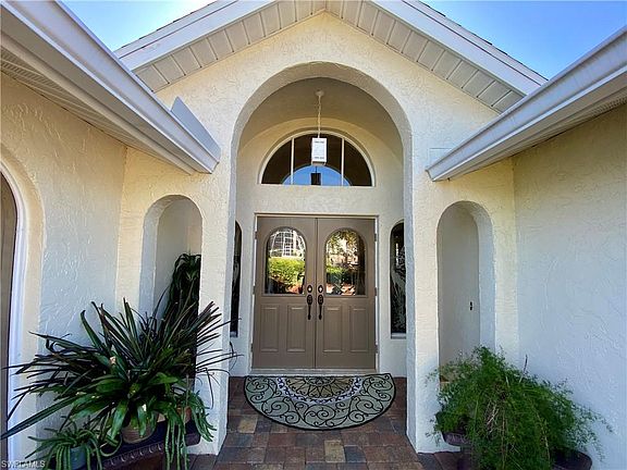 Your private peninsula with 230ft of water frontage! On this oversized property you'll find yourself surrounded by water offering expansive views in all directions. The captains walk with tiki hut and two boat lifts, one w/ canvas top, will make the boater's heart beat faster. Tucked away in a cul de sac with no traffic and all surrounding homes show true pride of ownership. The house has an inviting court yard double door entry leading into a spacious formal living area. The large family room with cozy fire place is just off the open kitchen. Pocket sliding glass doors from all living spaces merge the inside with the multi level outdoor pool and entertainment area. The Master suite has been redesigned with an open bathroom and California Style integrated closet. It opens to an elevated sitting area poolside. Both guest bedrooms are open to the pool area and the idyllic back yard. The guest bath also conveniently serves as a pool bath. Southern exposure with intersecting canals to the N,S and west will let you enjoy sunrise and sunset. Watch the dolphins play from your tiki hut in this breathtaking setting of glittering waters and sprawling lawns! Meticulously maintained property!