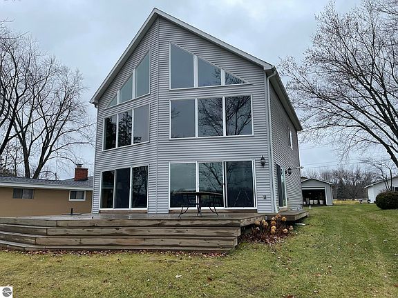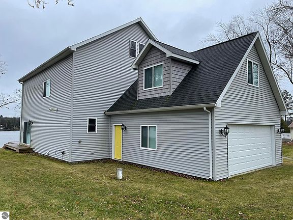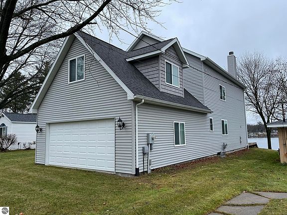 BEAUTIFUL APPROX. 2546 SQ. FT. HOME WITH ATTACHED TWO CAR GARAGE ON ALL-SPORTS RIFLE LAKE! On the main floor, the home features a master bedroom with a full bath, another one half bath and laundry room, a large island kitchen with gorgeous views of the lake, and huge dining/family room with wood burning fireplace insert. Heading upstairs you'll find a sitting room (could be used for extra sleeping space), a large bedroom with walk-in closet, another 3/4 bathroom, and a mostly-finished bonus room above the garage with another 3 beds and room for more. There's also a third-floor loft with another 4 beds! Outside the living room slider there's a large deck overlooking the water, and down by the water's edge is a newly constructed and landscaped patio area, a sandy beach area, and a steel seawall. The lake bottom is sandy for fantastic swimming! For even more storage, there's a detached 24x30 garage and 12x16 garden shed/workshop, and with the lot being approximately 667 ft. deep, there's plenty of room to expand even further!