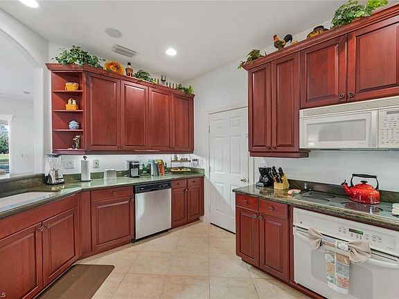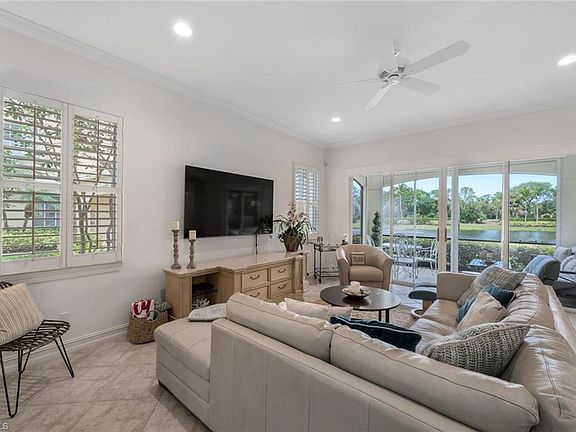Discover refined living in this stunning first-floor condominium at Bolero at Tiburon, featuring three bedrooms, two baths, and picturesque western lakefront and golf course vistas. Elegant tile flooring flows seamlessly throughout the home. The gourmet kitchen impresses with rich wood cabinetry, granite countertops, modern appliances, and a convenient breakfast bar. Retreat to the luxurious primary suite, complete with a spacious walk-in shower, a separate soaking tub, dual vanities, and a generous walk-in closet. The condominium comfortably sleeps guests with two king beds and one double bed and includes a two-car attached garage for added convenience. Nestled within a private, gated tropical oasis of just sixty residences, Bolero at Tiburon offers exclusive access to a resort-style pool. Steps from your door, the legendary Greg Norman-designed championship golf course and the upscale Ritz-Carlton Resort Hotel await, along with the Medallion Golf membership for an unparalleled golfing experience. Enjoy all the delights of Naples, from pristine beaches to fine dining and shopping, just moments away.