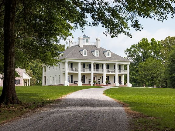 The grand entrance of this 137 acre estate begins the journey down the ¾ mile long treelined drive which meanders through multiple fields, past a covered bridge, and skirts the two acre pond and the fully stocked 8 acre lake. The trees unveil views of the stunning 8,500 sq ft antebellum home that is modeled after the Houmas House, known as the crown jewel of Louisiana’s River Road. Home boasts 6 bedrooms, 6.5 baths and four 11x65 porches framed out by grand columns providing sunrise and sunset views. Access to the pool area from bottom porch and from spiral staircase from second floor porch. The gunite pool is bookended by the 3 car detached garage and the 1600 sq ft pool house. The pool house features a full bar and living room downstairs and billiards room upstairs. Outbuildings on the grounds include a 60x100 party barn with stage for entertaining, full bath and living quarters, a 30x40 farm shop, 50x70 pole barn and 60x70 shop with full bath overlooking the lake and covered dock.