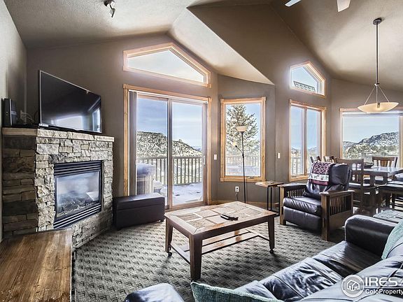 Experience the best of mountain living in this stunning end-unit condo at The Peaks at Mary's Lake Lodge! This fully furnished, turn-key property offers one-level living with no stairs and parking just steps from the front door. The open floor plan features vaulted ceilings, hardwood floors, and walls of windows that showcase breathtaking views of Rocky Mountain National Park Peaks and Mary's Lake. Relax on the spacious deck with a private hot tub or cozy up by the gas fireplace. The primary bedroom suite boasts a jetted tub and double vanity, while the second bedroom also has a 3/4 bath. Enjoy community amenities, including an outdoor heated pool, hot tub, and fire ring. With A - Accommodations zoning, this condo is perfect as a full-time residence or a short-term rental, offering flexibility for self-management or your choice of management companies. Don't miss out on this exceptional Estes Park retreat!