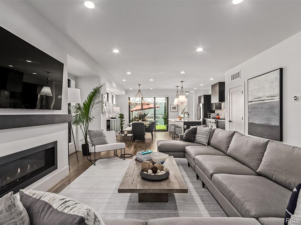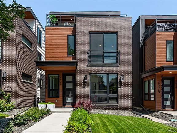 Stunning contemporary detached single-family home with a detached ADU/Carriage one bedroom apartment in highly sought-after Jefferson Park! Designed for both style and functionality, this residence has an abundance of natural light and features soaring ceilings, hardwood floors, and elegant finishes throughout. The main level includes a dedicated office, powder room, inviting living room with electric fireplace, dining area, and a chef-inspired eat-in kitchen complete with a farmhouse sink, stainless steel appliances, 6-burner gas range, French door refrigerator, full marble backsplash, under-cabinet lighting, and sleek hard-surface countertops. A built-in cubby entryway and separate mudroom add convenience and charm. Upstairs, the luxurious primary suite boasts a walk-in closet, spa-like 5-piece bath with a freestanding tub, floating double vanity, walk-in shower, and a Juliet balcony. A second ensuite bedroom and full laundry room with utility sink round out the second floor. The third level offers a spacious family room with a wet bar and beverage fridge, additional guest bedroom, full bath, and direct access to a private rooftop terrace with stunning city views. The detached two-car garage includes a fully equipped carriage house with its own living room, kitchen, bedroom, bathroom, and separate entrance—perfect for guests, short-term rental, or extended stays. Enjoy a low-maintenance patio with privacy fencing, across from Briar Commons Eatery & Brewery, with easy access to downtown and I-25. This is city living at its finest!