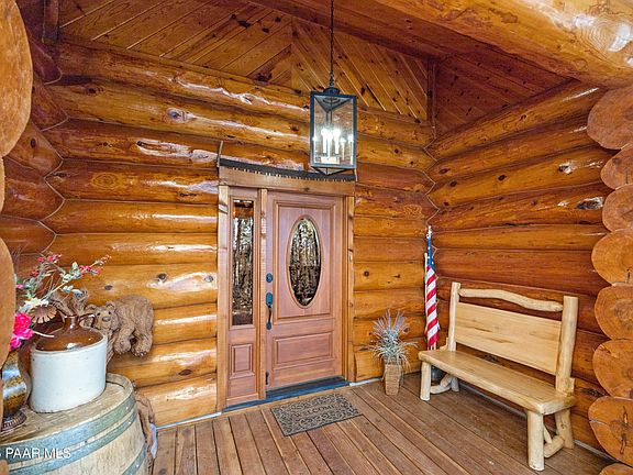 CUSTOM LOG HOME - CAR COLLECTOR, VRBO or HORSE OWNER OPPORTUNITY -NO HOA - PRIME LOCATION on 2+ Acres close to Prescott Town Square with car barn/ 4 stall barn/workshop, Greenhouse, and storage. Main Level features open floor plan, Great Room, Chef's Kitchen, Viking appliances, Dining Bar plus Dining Room, 2 bedrooms, designer bath, and Laundry Room. Upper level features an expansive Primary Suite with sitting area. a large Entertainment Loft that overlooks the Main Level Great Room, and an office/4th bedroom option. Key features include a private Well plus a 20-year Solar lease that is paid in full through 2033. Home is enhanced by entertainment decks surrounding the home, a Creekside sitting area, water feature and views.