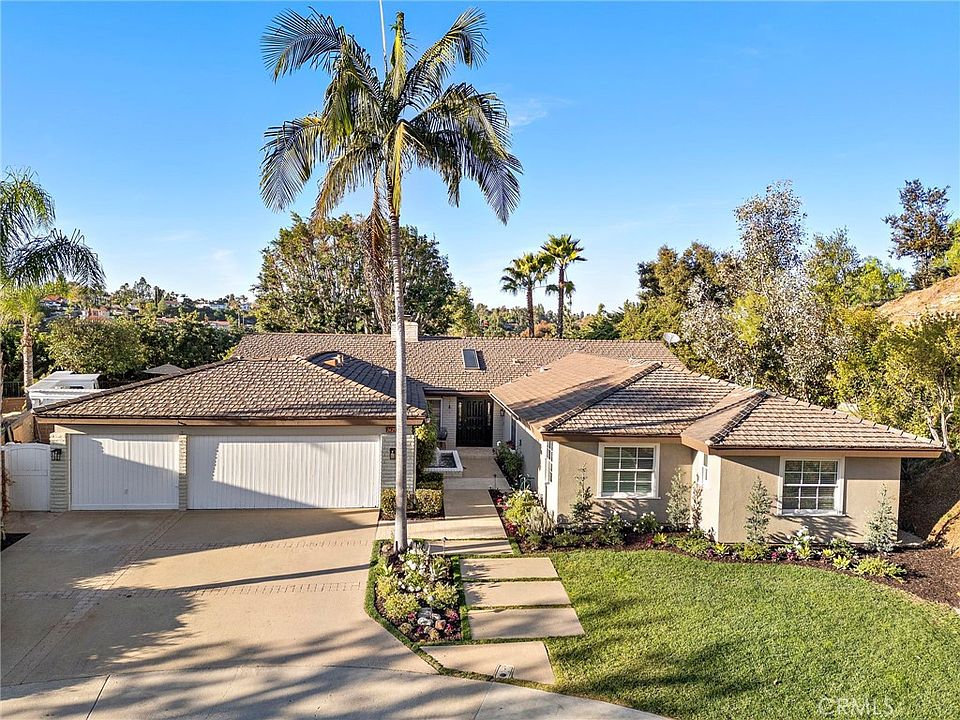 Spacious, inviting and showcasing a complete professionally designed remodel, this rare Mission Viejo home is poised to bring you enjoyment for countless years to come. The impressively proportioned single-story residence is located on a cul-de-sac at the end of a quiet single-loaded street in the preferred neighborhood of Mission Ridge. Its expansive homesite of nearly 15,950 square feet is elevated and exceptionally private, with only one direct neighbor and views that stretch across the valley to mountains on the horizon. An open courtyard provides a warm welcome to a foyer with skylight and spacious living areas that effortlessly flow from one to the other. White open-beam vaulted ceilings lend architectural drama, and walls of glass bring natural daylight indoors. Approximately 3,750 square feet, the five-bedroom, 3 bath design features generous living and dining rooms, and a family room with fireplace. A custom wet bar with built-in under-counter wine refrigerator is shared with a remodeled chef’s kitchen that boasts a stunning amount of custom Shaker cabinetry, an according pass-thru window to the backyard, open shelving, a massive island, quartz countertops, designer-tile backsplash, and high-end appliances including a built-in refrigerator, dual dishwasher's and a six-burner range with griddle and pot-filler. Catering to an array of lifestyles, the home features two primary suites, including a junior primary with jetted tub, marble floor, walk-in closet and access to the entry courtyard. The main suite opens to the backyard and hosts gorgeous picture-frame mirrors, a free-standing tub, two sinks, and a walk-in shower with frameless glass enclosure. Every detail of the residence has received careful attention, including white French oak hardwood flooring, designer tile, smooth-coat interior walls, upgraded windows and doors, upgraded HVAC and water heater, recessed and designer lighting, and custom millwork including crown and base molding, and built-in cabinetry and shelving. Abundant storage enhances the interior large laundry room and an attached three-car garage. Enjoy a vacation vibe in the wraparound backyard, where everyone will appreciate a pool and spa, an open-air fireplace with seating, and a beautiful shade tree and lawn. Mission Ridge is located next door to the fairways of the Mission Viejo Country Club, and it is close to acclaimed schools, The Shops at Mission Viejo, and endless recreational attractions including Lake Mission Viejo.
