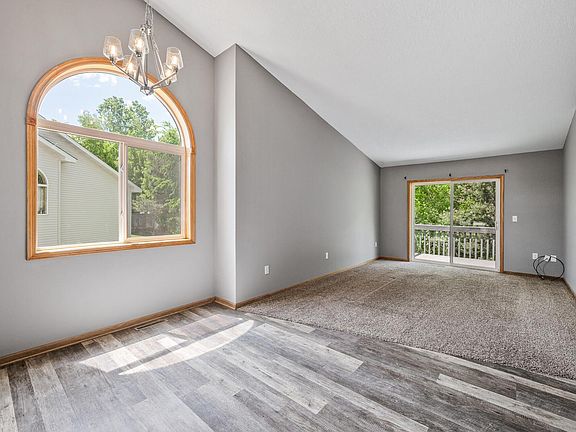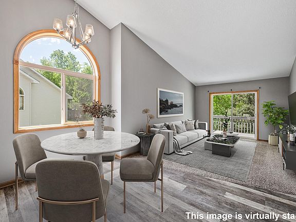 Step into this inviting split-level townhome and enjoy the ease of maintenance with lawn care and snow removal handled for you! Fresh paint throughout enhances the bright, neutral palette. The upper level features vaulted ceilings, abundant natural light, and an open floorplan that seamlessly connects the kitchen, dining, and living areas. The kitchen boasts rich wooden cabinetry, a sleek tile backsplash, and stainless steel appliances. Just off the main living area, you'll find one bedroom with a spacious walk-in closet and a full bathroom with a tub nearby. Step out onto the maintenance-free deck, perfect for grilling and relaxing. Downstairs, you'll find two additional bedrooms, another full bathroom, and a cozy family room, ideal for movie nights or game days. The laundry room is also conveniently located on the lower level. Updates include a new roof in June 2023, carpet replaced in 2019, a gas water heater replaced in 2018, and a serviced furnace with a new blower in 2025. The reasonable HOA fee includes weekly garbage removal. With convenient access to Highway 169, commuting to the cities is a breeze. Enjoy nearby trails, parks, and the natural beauty of Sherburne National Wildlife Refuge!