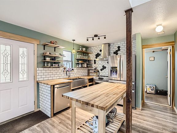 - Butcher Counters, High Ceilings, Kitchen Island, Open Floorplan, Vaulted Ceiling(s)