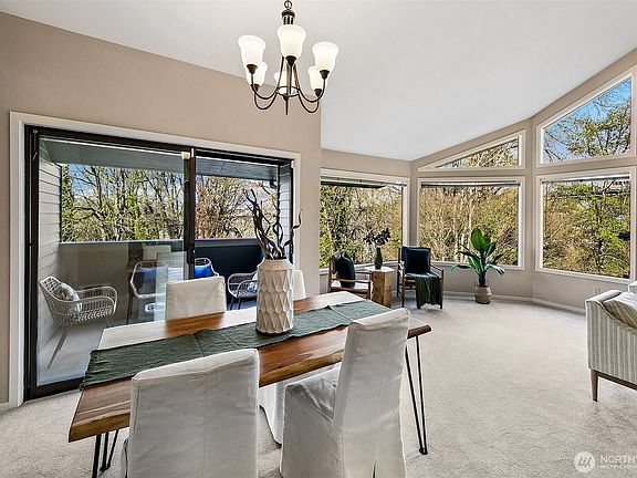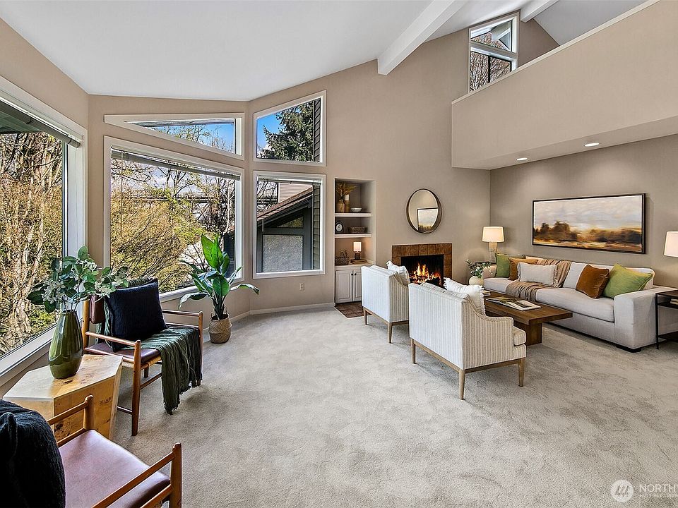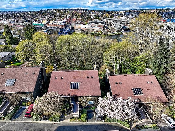 Enjoy ultimate privacy looking out big windows to trees, Fremont, and Lake Union. Top floor 2 level condo is not your basic condo with vaulted ceilings and huge windows. Brand new kitchen (in 2025!) with hardwoods, formal dining space, a private deck, and large living room featuring a fireplace and walls of windows. 3 bedrooms; two on the main floor with a full bath and a high ceiling loft style primary bedroom with ensuite bath and huge walk-in closet upstairs. New carpet and fresh paint throughout. Plenty of storage, including a large room for en suite laundry and extra closet space. Garage parking included and additional guest parking available. HOA includes utilities plus high speed internet, Insurance, Grounds and Exterior maintenance.