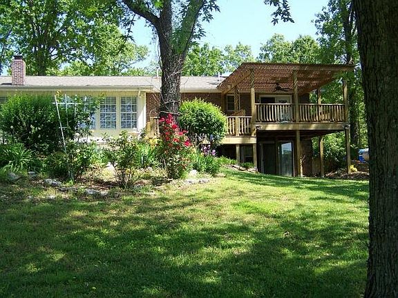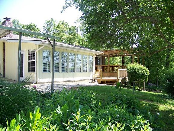 Beautiful Setting, just off the pavement! This nice brick home features 3 bedrooms (3rd could be a family room), 2 baths, a gorgeous updated kitchen w/Ty Jolliff cabinetry and stainless steel appliances, living and dining combo has hardwood floors and a brick fireplace w/gas logs. Grab your coffee and enjoy the wildlife that venture into the amazingly inviting yard, from the comfort of the heated and cooled sun room. The wildlife and birds may be coming to drink from the large well stocked pond. Lots of landscaping, fruit trees, grapes and outdoor living areas, including a large deck w/pergola canopy, just off the master bedroom and then an open deck, both which have a great view of the stocked pond and back yard. Property also has a Gazebo for outdoor entertaining and a 30 X 40 Shop
