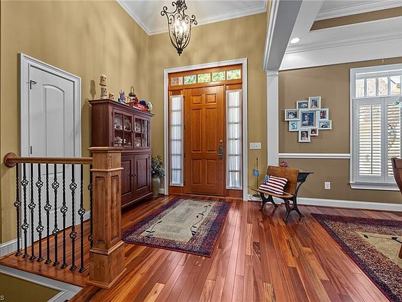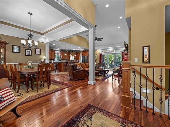 Brick homeEze-breeze porchU-shaped drivewayTiger wood floorsLarge islandCustom detailsDen with kitchenette