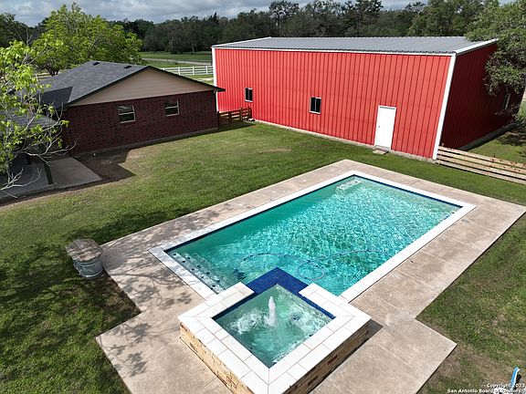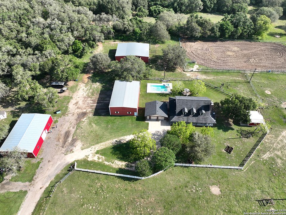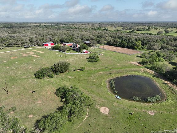 This 85 acre ranch in Goliad, Texas is outfitted with everything you need. The 2,880 square foot home sits on 85.12 acres with multiple outbuildings, pool, hot tub, detached two car garage with extra storage, and a wrap around porch. Enjoy your morning coffee on the patio and take in the sunrise and the South Texas country views. The land is perfect for grazing cattle or horses, it has year round live water, The 15 Mile Creek, a stock tank, and has an abundance of wildlife. This immaculately kept home has 5 bedrooms, 2.5 bathrooms, a dedicated office, living room with a masonry fireplace, and formal dining room. This property has three outbuildings and a well shed with additional storage. There is a perfect building site for an additional dwelling complete with it's own septic and well, already in place. The property is fenced and cross fenced The first outbuilding is 40x60x16, built 2019, is energy efficient lined with spray foam insulation, insulated garage doors, central HVAC, a dedicated office space, and is plumbed for a kitchen area and a 1/2 bathroom, and all outlets are GFCI. The second outbuilding is 40x60x16, built in 2003, is fully insulated, plumbed for a bathroom, one stall will fit an RV, and has an RV hookup. The machine shed 40x65, built in 2001, four horse stalls, tack room - 10x15 - with a sink, hay loft, and has water and electricity. The little red barn (well shed) is 16x20, is perfect for 4H projects and is partially walled off for chickens, rabbits, turkeys, etc. Enjoy viewing the wildlife, Whitetail Deer, turkey, dove, quail, ducks, and hogs, or hunting your own ranch. 25 miles to Cuero, 23 miles to Victoria, and 91 miles to Corpus Christi, the location is perfect! Send the kids to school in Goliad Independent School District by day, and home at the ranch by night! Or slide over to Schroeder Hall for an evening of fun. This is a must see property to appreciate everything it has to offer.