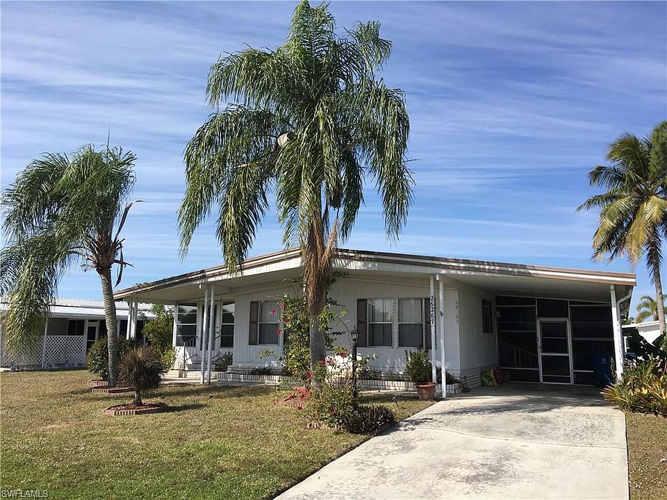 H.14183 - Large lot with brand new $10,000 spa bath room and $3,500 updated electric. Two bedroom 2 bath home offers the best of both worlds with glassed in patio on one side and screen lanai on the opposite side.Brand new bathroom offers step in shower with beautiful tile with soothing color palate. Two separate storage areas provides ample storage. Centrally located close to downtown Old Bonita. Active community. The home is offered furnished with small list of exclusions.