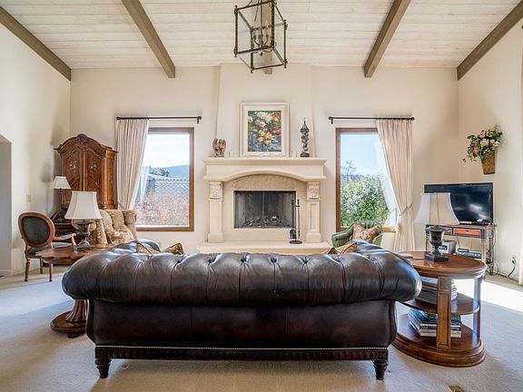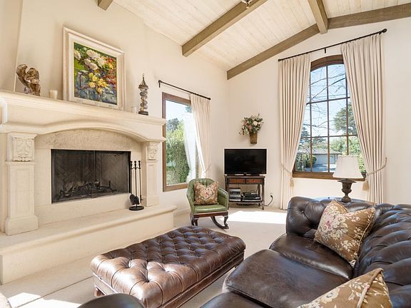 Glorious! On a hill above the Carmel Mission lives this beautiful custom home in Hatton Fields graced by abundant sunshine and majestic mountain views. Just minutes away from the beach, award-winning Carmel schools, exceptional private schools, restaurants and shops, the location could not be better. In this peaceful neighborhood, the home delights everyone with its incredible curb appeal. As you approach the semi-circular driveway and enter the portico, you are welcomed by curving boxwood hedges, roses, lavender and a fountain. Lovingly remodeled inside and out with the greatest attention to detail, superb craftsmanship and materials, the home features old world charm and every modern convenience. Fabulous floor plan with two bedrooms on the main floor: a wonderful master suite including huge walk in closet and jetted tub, and an additional guest room with en suite bathroom. Two more bedrooms with walk-in closets and full bathroom are found on the second level. Greatroom features a cathedral ceiling and elegant stone fireplace. Entry hall, kitchen, and formal dining room have wide-plank oak floors from Belgium. Bathrooms and kitchen include limestone and tile from Jerusalem, Egypt, and Europe, as well as custom cabinetry. Gourmet eat-in kitchen contains Shaws Original farmhouse sink, Wolf Range, SubZero refrigerator and Bosch dishwasher with custom panels. Solid wood doors throughout and Kolbe energy efficient windows provide views from every room, while French doors open to a peaceful courtyard deck. Fenced backyard includes large patio, lawn, mature trees, flower gardens, sprinkler system, and dog kennel. Privacy, comfort, and distinctive character make this perfect place to call home in Carmel.