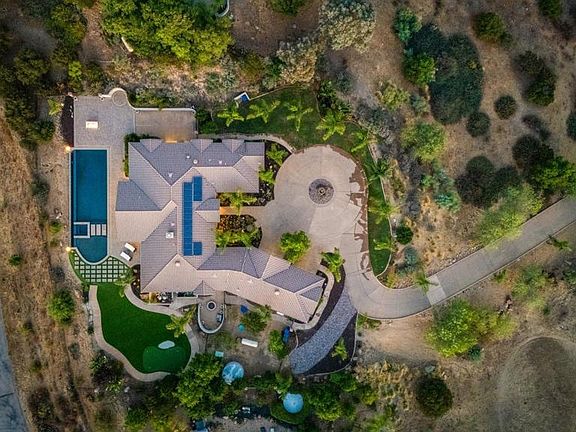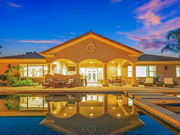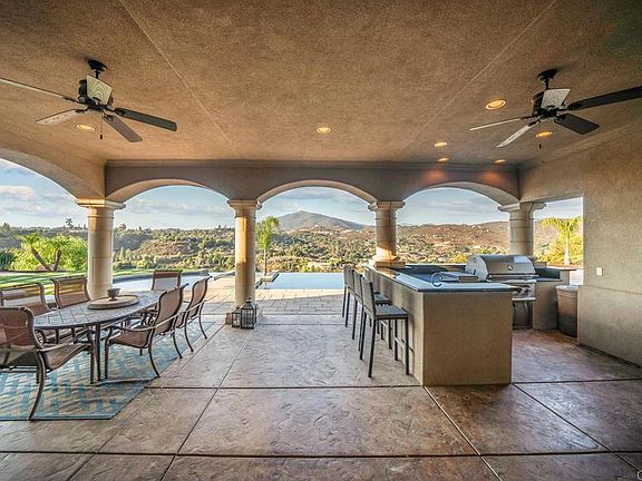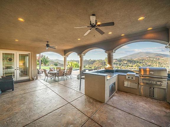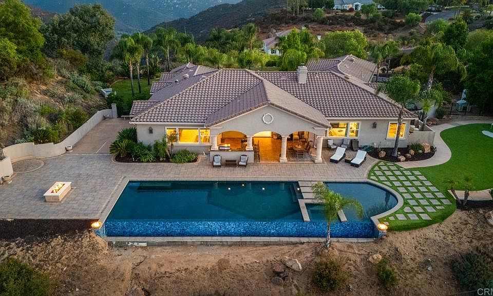 Rancho Palo Verde is a Guard gated community nestled in the mountains of Alpine. This property is immaculate in every way. Driving up to the circular driveway you are greeted with lush, yet drought tolerant landscape, four car garage (two extra deep), fountains, and breath taking views of the southern mountain tops. Walk through the custom glass and hand crafted metal design front door to be greeted by an open great room. Continue straight through the patio doors to a brand new custom 150 foot infinity edge pool complete with a baja area, umbrella holes, floating steps, fire bowls, and large jacuzzi with a back drop of Viejas mountain. Outdoor firepit, artificial turf with putting green, mature fruit trees, brand new AMG built in barbeque, outdoor burners, sink and warming drawer. Two wings of the home offer privacy for everyone. Fifth bedroom is currently used as a movie room complete with surround sound, private access to yard and en-suite bathroom. The kitchen offers open concept living, stainless steel Bosch and Dacor appliances, and GE monogram fridge. Mini bar offers a new wine cooler and extra storage space. Primary bedroom is expansive with direct patio access through french doors. Primary bathroom will make you feel like you have your own spa with oversized walk in shower and jet tub! Paid leased solar panels, a new Generac generator to keep you comfortable if the power goes out, and a well! Irrigation is completely automated with an app! The community offers a private lake for fishing, boating, swimming, kayaking, paddle-boarding, a marina, community center, picnic area and fitness center! This home truly has it all!