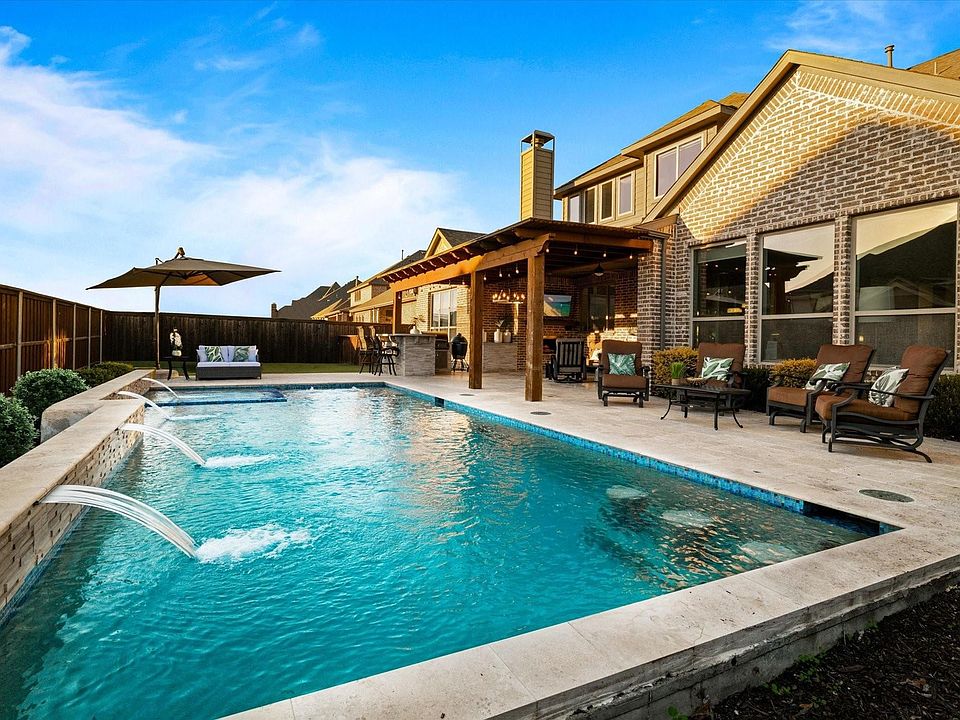 Active Kickout Status! Resort-Style living in this 5-bdrm, 5.5 bath Shaddock home located in the highly sought after master-planned community of Mustang Lakes! PROSPER ISD. Recent upgrades include new approx. 80oz carpet, lighting, appliances and landscaping. Ideal open floor-plan with hardwood floors, designer lighting, quartz countertops, expansive kitchen cabinetry, 5 burner gas cooktop, automatic window shades, master closet system with built in jewelry drawers and hamper. Primary and guest bdrm downstairs, 3 bdrms upstairs all with en-suite bathrooms. Amazing backyard oasis with heated pool, spa, outdoor kitchen, fireplace, maintenance-free artificial turf, dog run, travertine decking and extended patio with pergola. 3rd car garage complete with heating and cooling unit can be used as a gym or workstation. Onsite elementary school, resort style pools with cabanas, fitness center, tennis courts, sports courts, fishing lakes and more. Easy access to DNT, US Hwy 75 and 380.
