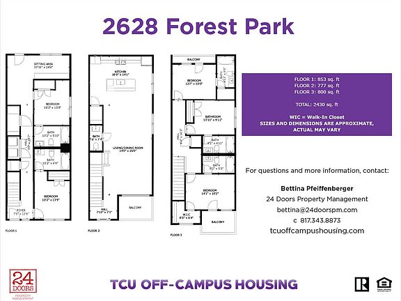 TCU housing at its best. There are 5 generous private bedrooms, each with a private bathroom and private coded door lock. The common floor features solid surface floors, a balcony, large open living area with flat screen TV, powder bath, and a kitchen your parents will envy. There are 2 bedrooms on the 1st floor and 3 on the 3rd floor with a set of washers and dryers on each floor so no schlepping up and down the stairs to do your laundry.