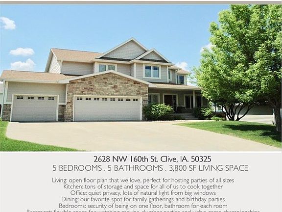 Fantastic resale home in sought after Clive neighborhood. We have filled this place with love and laughter as our family has grown up and now we're ready to pass on the joy to another great owner! Lots of space, plenty of bathrooms and a fenced yard in a super friendly neighborhood. Brand new carpet and appliances with custom painted cabinets in the kitchen. Basement perfect for entertaining kids, grown-ups or both! Hardwood floors, crown molding, neutral paint and white trim. Cozy fireplace to snuggle up for a movie. Main floor office with french doors. The front porch is our favorite spot for morning coffee or evening glass of wine. Your new memories are waiting!