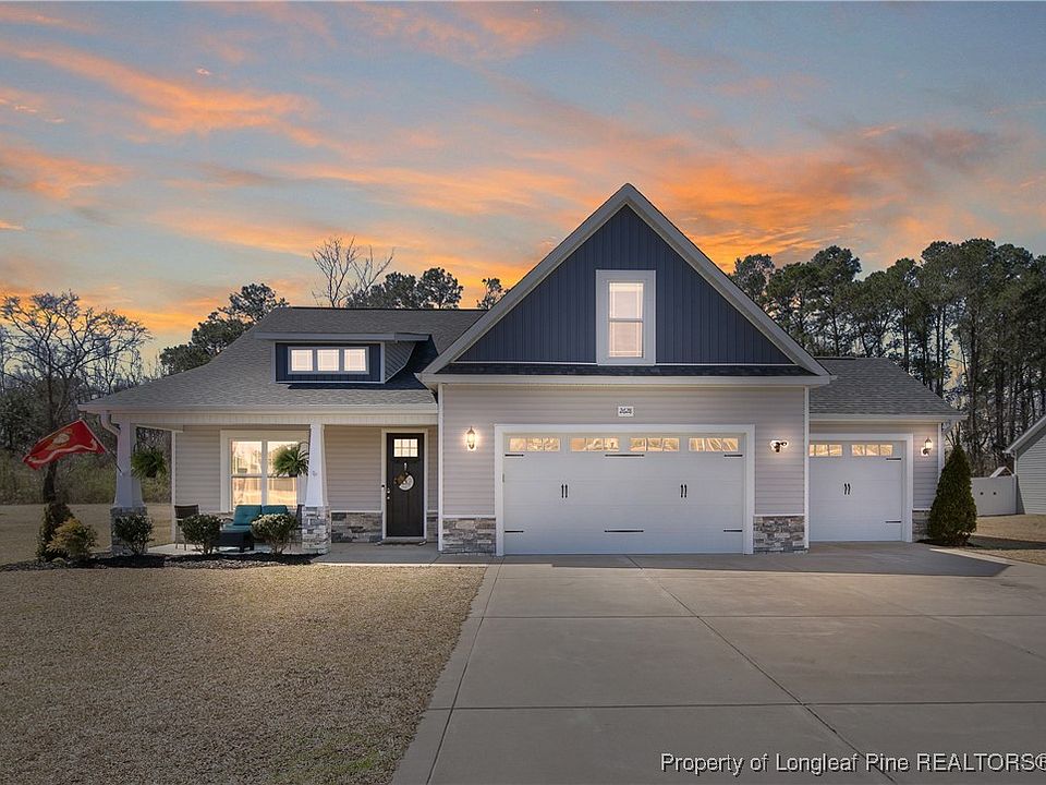 This Cape Cod home offers over 2,700 square feet of thoughtfully designed living space on nearly an acre in the James Place subdivision. Built in 2019, it features a spacious kitchen with granite countertops, stainless steel appliances, a walk-in pantry, built-in desk, and oversized island. The formal dining room includes a coffered ceiling and French doors. The main level primary suite is complete with double vanities, garden tub, separate shower, and walk-in closet. Additional highlights include a gas log fireplace in the great room, upstairs flex space, three-car garage, covered front and rear porches, and a well water purification system. Fresh paint throughout. Reverse osmosis system installed in 2019, luxury vinyl plank and tile flooring in main areas, and a huge fenced backyard offering privacy and space for outdoor enjoyment.