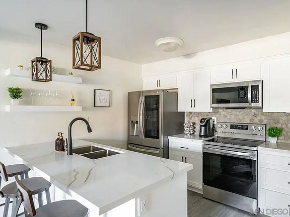 Resort style living in this completely remodeled top floor unit in Point Loma Tennis Club. This unit is light, bright and airy with an open concept floorplan. The kitchen features high end finishes, white Shaker custom cabinets, stainless steel appliances, beautiful floating shelves and room for 4 barstools at the counter. The unit has luxury vinyl floors throughout, updated dual pane windows and dual sliding glass doors that lead to the private balcony from both the bedroom and the living room. Bathroom finishes match the kitchen with plenty of storage. Enjoy the Tennis Club's large resort style pool, spa, BBQ area, tennis and pickleball, pool table, ping pong, foosball, poker table. There are 2 gyms, a weight room and an aerobic exercise room with treadmills. Complex is pet friendly and close proximity to all beaches restaurants and entertainment. VA and FHA approved building.