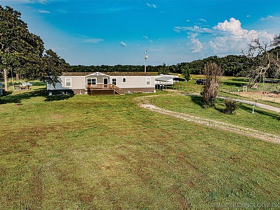 2019 Clayton Like NEW-Farmhouse upgrade package, spacious 3 bed, 2.5 bath, 2 living, 18' feet wide mobile home on 10 productive acres m/l. Kitchen features a stainless farmhouse sink, island/bar and vinyl plank flooring with a 1/2 bath right off kitchen. Separate utility room and split floor plan. Extra bonus "Stay or Play" room can be used as a office, game-room, or additional living room to meet your needs. Master bathroom has a walk-in shower and double vanity. There are 2 additional bedrooms with a Jack and Jill bathroom. There is a large deck on the back for entertaining, small greenhouse, well-established garden, and storm cellar. The huge pasture has new fencing on three sides, is open for prime grazing. There is an additional livestock pen currently used for goats and chickens. Conveniently located on the paved Wilson Road, just 2-3 min north of the town of Henryetta, approximately 45 min south of Tulsa Hills area, easy access to Hwy 75.