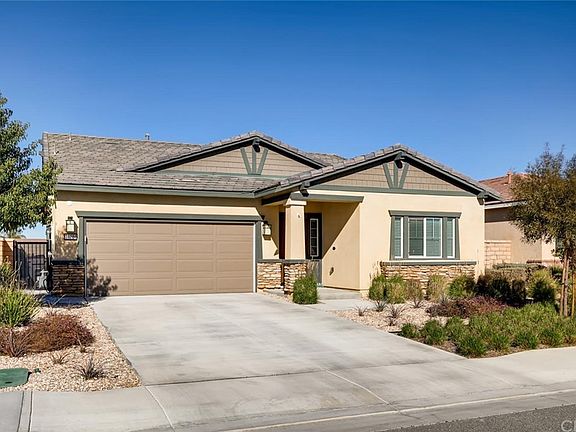 Absolutely stunning highly customized near new home at a premier "Over 55" gated resort. This home shows better than the builder's models and sits on a very private view lot. Great curb appeal with a Craftsman style facade, flagstone type accents and covered front porch. Contemporary energy efficient design, two master suites plus den/office/formal dining room. 2 1/2 baths. Beautiful upgraded tile floors through the long entry hall, great room, kitchen, baths and laundry. Custom paint and 4-panel coventry doors throughout. The big great room opens to the fabulous kitchen featuring granite counters, an island with sink, walk-in pantry, Thermofoil cabinets, 5-burner range and stainless steel appliances. Elegant view master bedroom with ceiling fan overlooking the lush yard. The Master bath has a dual sink stone counter vanity, huge shower, elongated toilet and walk-in closet. Front Junior master suite with private full bath. Large laundry room with cabinets galore and folding counter. The oversized 2-car garage has epoxy floors and a tankless water heater. Extraordinary low maintenance view rear yard with full width stamped concrete covered patio (California Room), colorful gardens with automatic accent lighting & artificial turf. HOA amenities include a gorgeous pool & spa, BBQ party area with fireplace, big clubhouse with billiard table, kitchen, meeting area, indoor and covered outdoor lounges plus a separate fitness center building. HOA dues include front yard maintenance.