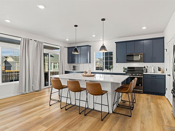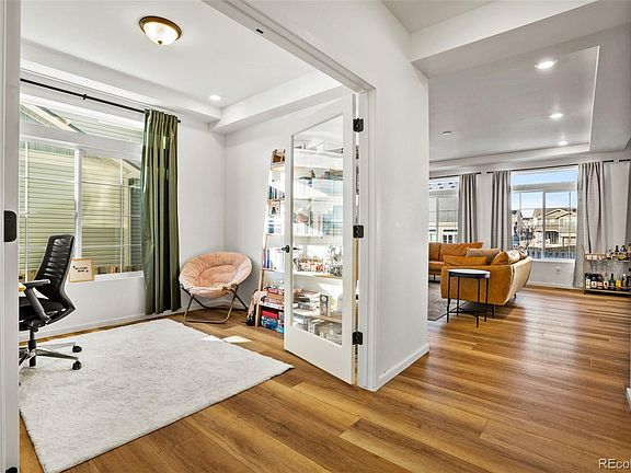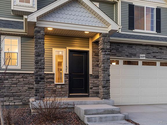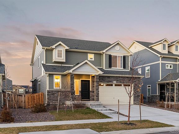 Stunning modern design choices and fixtures abound in this 3 bedroom, 3 bath plus office and loft now available in Adonea! The main floor is a complete showstopper with it's open concept floorplan. Wide plank luxury vinyl flooring leads you from the front entrance, past a private main floor powder room and large office with double french doors. The home opens to a large living space with a modern floor to ceiling black tiled fireplace that provides a dramatic design effect set against a back wall adorned with several large picture windows that let in an abundance of natural light. The kitchen features an oversized center island with upgraded pendant lighting that easily sits 8 people with plenty of room to cook and entertain; showcasing quartz countertops, oversized 42" cabinets, tile backsplash, LG refrigerator and gas oven. A large double door walk in pantry also adds to the functionality of the space. The kitchen opens to a covered patio and private backyard that is fully fenced with privacy fencing. Upstairs features a large loft, two additional bedrooms and full bath with a large laundry room with newer washer and dryer that are included. The oversized Primary Suite is tucked away in the back of the home for privacy and features double sinks and a frameless floor to ceiling tiled glass shower with rain shower head. Adonea is a master planned community that offers residents an outdoor pool, clubhouse, sand volleyball courts, parks and trails. Located within walking distance to Vista Peak High School and minutes off of the E-470 corridor within a 20 minute commute to DIA and Buckley Air Force Base to the north and ease of access to the Southlands area to the south for dining, shopping, and entertainment.