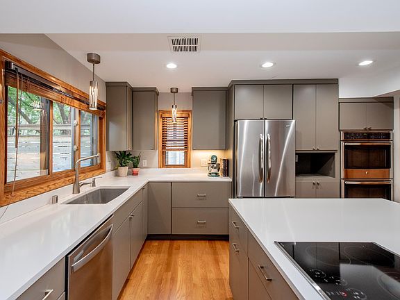 Refreshed Birchwood mid-century modern gem with extensive kitchen, dining, entry, and laundry renovation and major landscaping improvements to the front, backyard, and side of home! The main level features a designer center island kitchen with solid surface counters, sleek cabinets, pendant and recessed lighting, HW floors, and SS appliances. Just out the front door off the kitchen is a double stone patio for all of your dining, grilling, and entertaining needs. A dual sided wood-burning brick fireplace, tiled front mudroom and rear entrance from garage, separate dining room off kitchen, convenient main level laundry room, cozy family room, and a half bath round out the main level amenities. The upper level boasts an owner's suite with walk-in closet and 3/4 tiled bath with frameless glass shower divider, two additional bedrooms with ample closet space, a tiled full bath, and a fourth bedroom that could also be used as a flex space. Above the garage is the spacious 18' X 21' family room with wet bar, bay windows, and sliding glass doors out to the deck and backyard. The spacious and fully fenced backyard with mature trees offers maximum privacy. Enjoy tranquil evenings surrounded by nature from the back deck and usable yard with plenty of running room. Newer washer, dryer, water heater, water softener, and more (see list of home improvements).