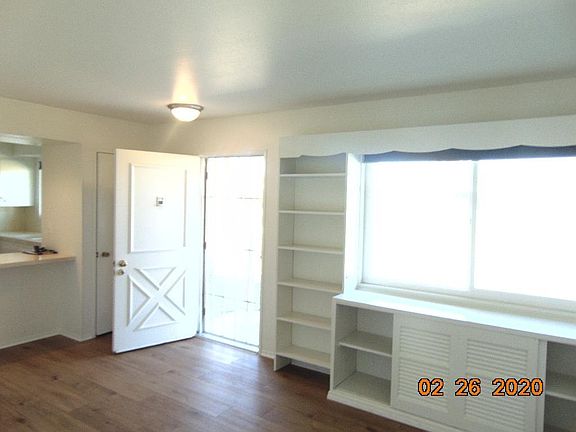 Quaint 1 bedroom senior home ready for its new tenant. Walk into the property and you enter a large living area that includes a built-in hutch. Next to the living room is the kitchen which includes upgraded appliances, multiple cabinets for storage and a refrigerator. Next to the refrigerator is the hot water heater with a washing machine. Dryer is located in the garage in the small storage room. The bathroom is down the hall and includes a walk-in shower with a single sink vanity. The bedroom is large with mirrored closet doors and a slider door to an enclosed bonus room that also has access to the enclosed mini outside area. This property is located near multiple shopping centers and the 215 freeway.